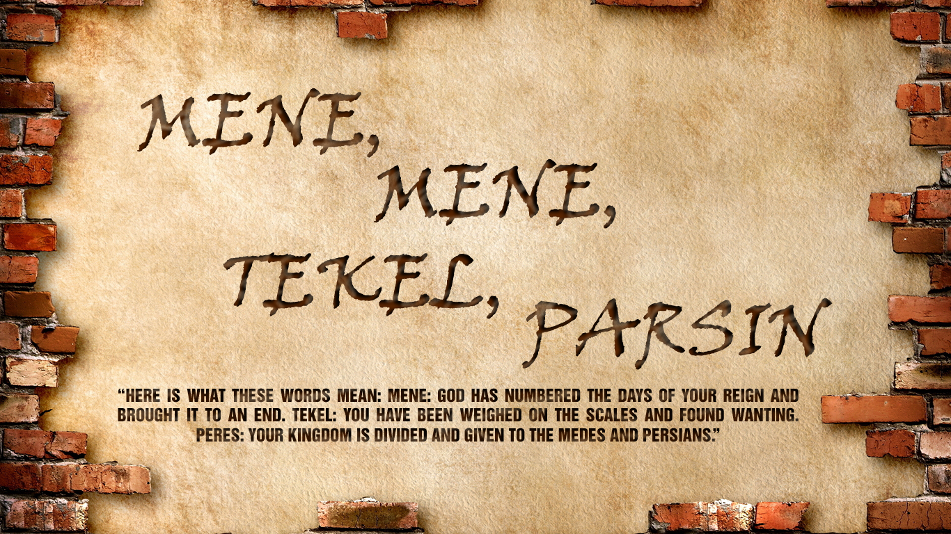 “因此从神那里显出指头来写这文字。所写的文字是:弥尼,弥尼,提客勒,乌法珥新。讲解是这样:弥尼,就是神已经数算你国的年日到此完毕。提客勒,就是你被称在天平里,显出你的亏欠。毗勒斯(与乌法珥新同义),就是你的国分裂,归与玛代人和波斯人。”(24-28)