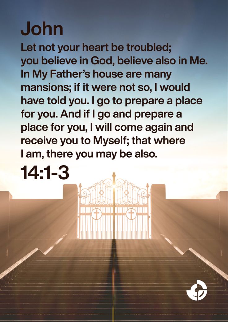 “你们心里不要忧愁。你们信神,也当信我。在我父的家里,有许多住处。若是没有,我就早已告诉你们了。我去原是为你们预备地方去。我若去为你们预备了地方,就必再来接你们到我那里去,我在哪里,叫你们也在那里。”(约14:1-3)
