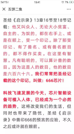 这是异端安息日会的,他们最喜欢讲这方面的 芯片 666 兽印等这类信息。什么人体芯片这些信息都是胡说八道的东西。现在都可以刷脸了,哪里需要这个所谓的芯片?敌基督要控制人,不需要用这么笨的方法。